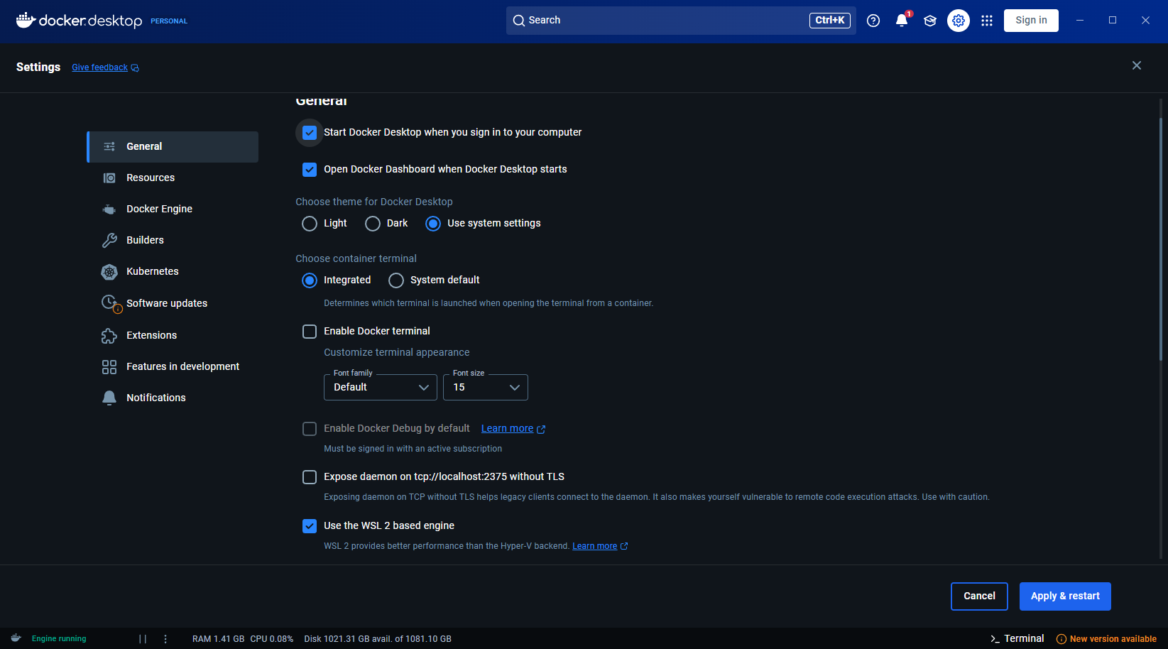 During the install don't forget to tick the Use **WSL 2 instead of Hyper-V** checkbox.