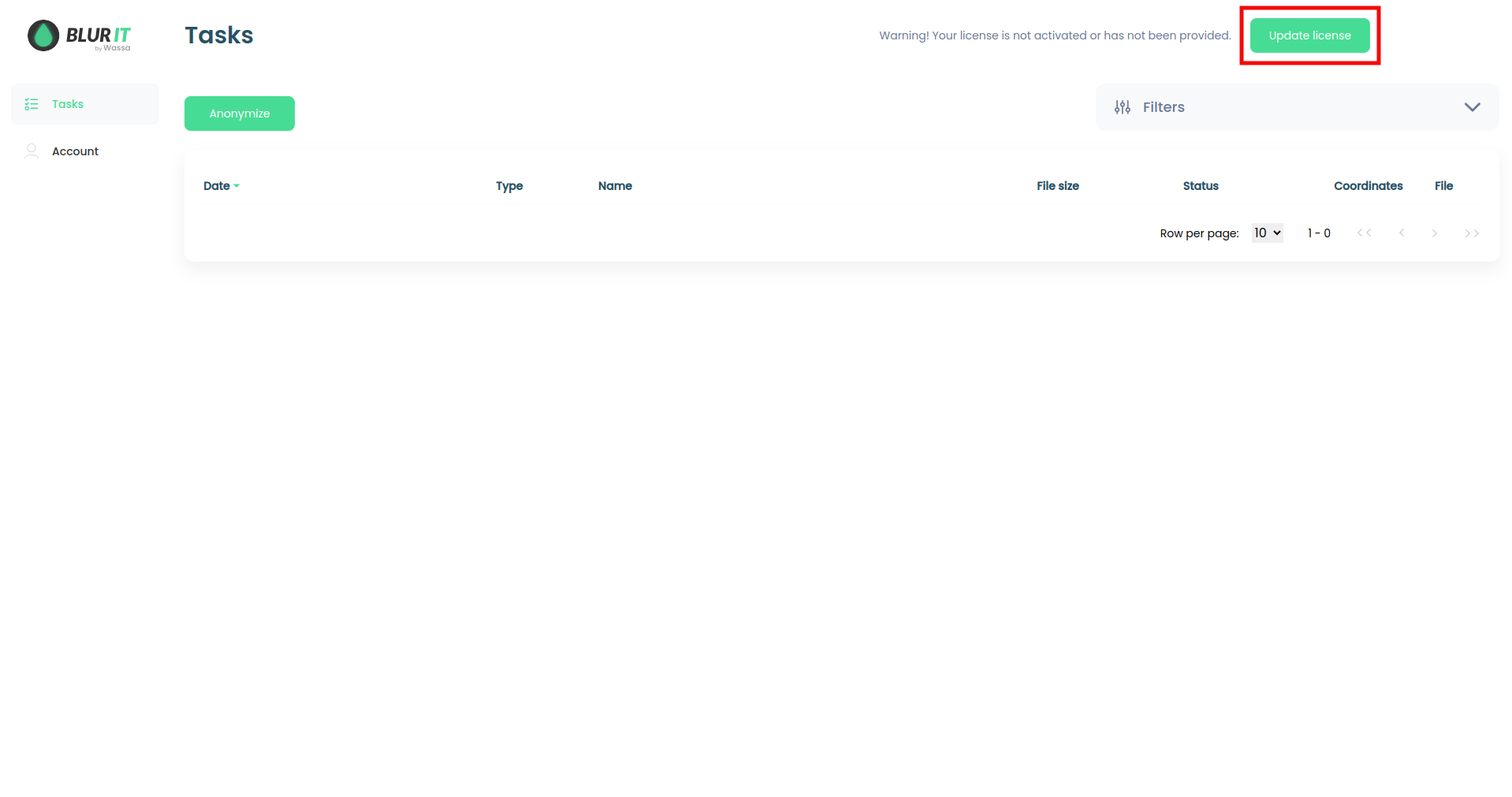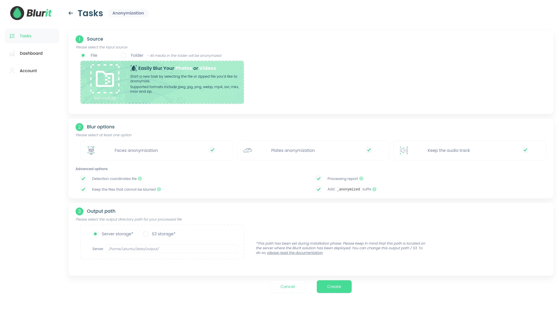 To start a task, go to Tasks page (/tasks) by clicking on side menu "Tasks" and click on the "Anonymize" button.